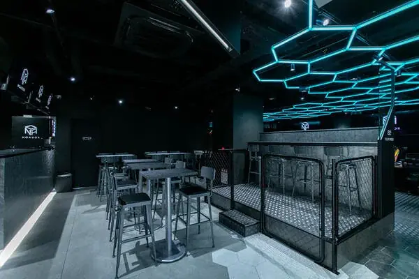 施設はゲーミングデザインを重視した空間設計で、高発色のLEDライトを用いた演出が可能です。照明カラーの変更やチームカラーへの合わせ込みができる点を強調しています。