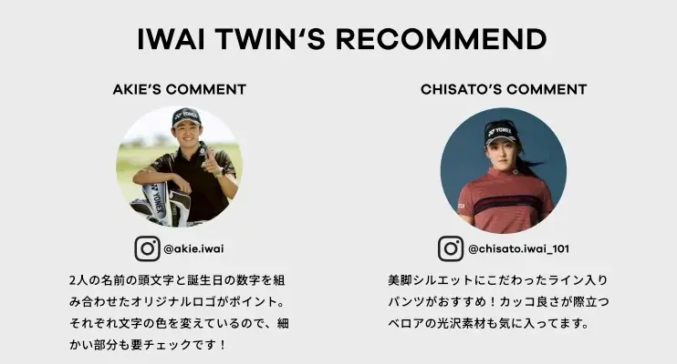 - コラボの背景:岩井明愛・千怜プロは今季アメリカツアーでも活躍しており、そのプレースタイルと着こなしの思想を服作りに反映。