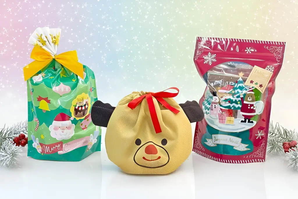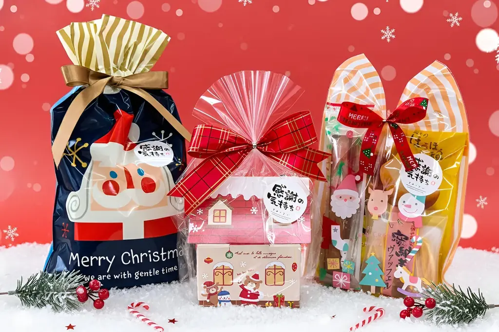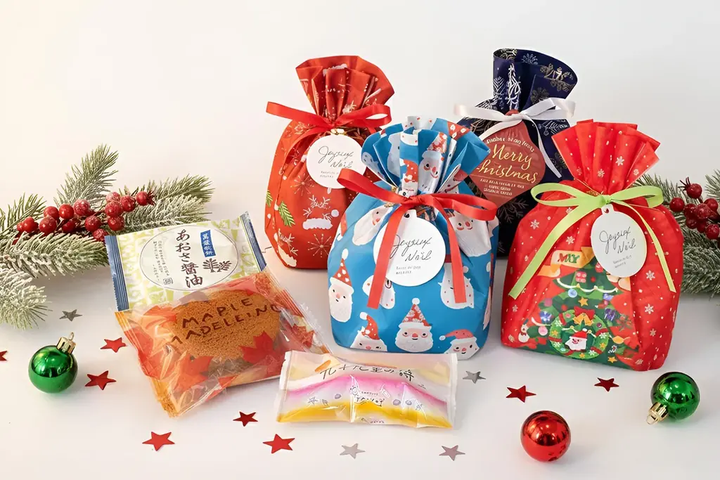 | クリスマス 巾着ギフト | ¥590 | 花彩菓・メープルマドレーヌ・おせんべい | 巾着は再利用可能 |