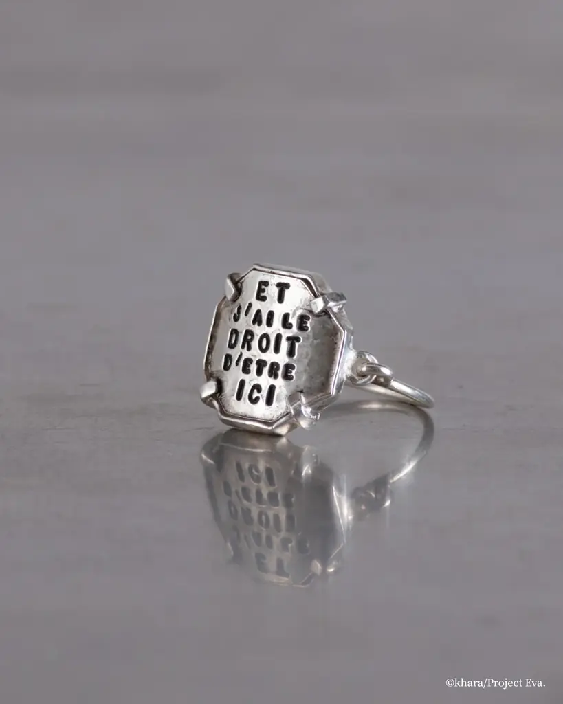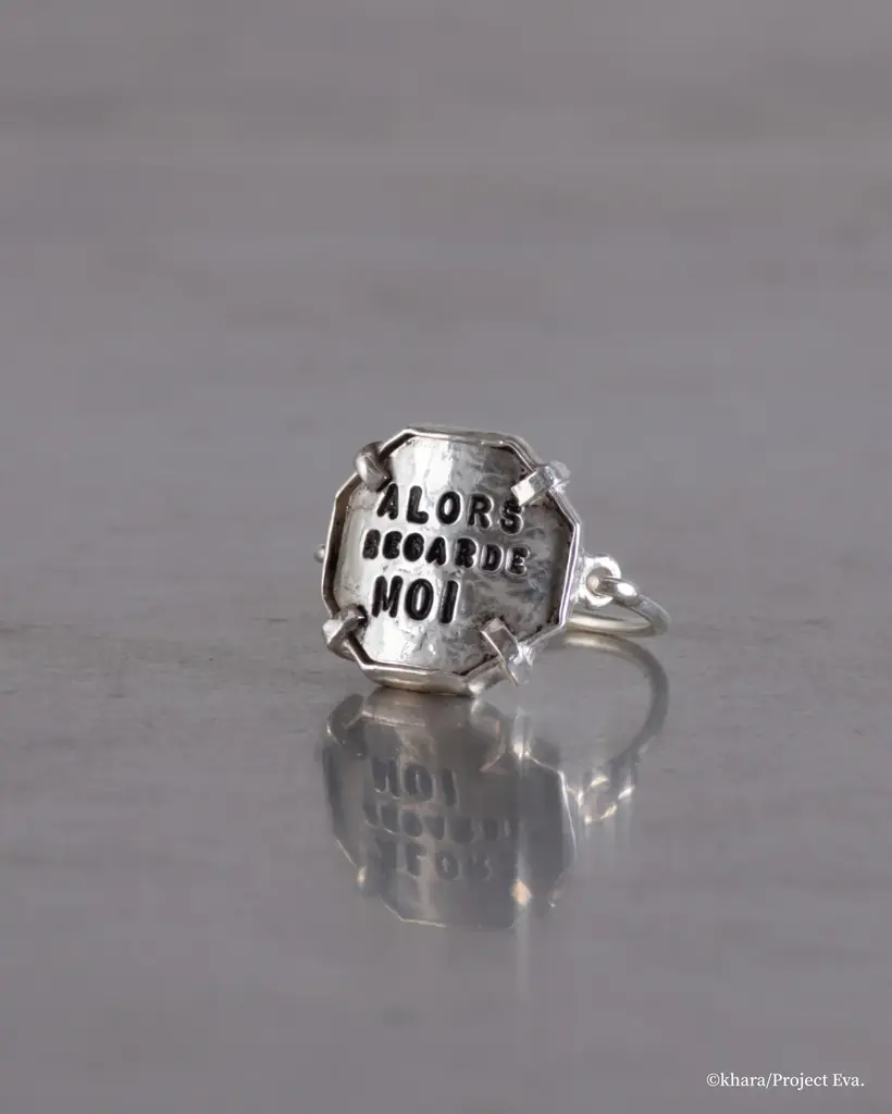 この八角形はリング、バングル、ネックレスのフレームに落とし込まれ、叩き上げたメタルの粗野で力強い質感と、刻印された言葉が併存することで、日常で使える保護と励ましの意味合いを持つジュエリーになっています。