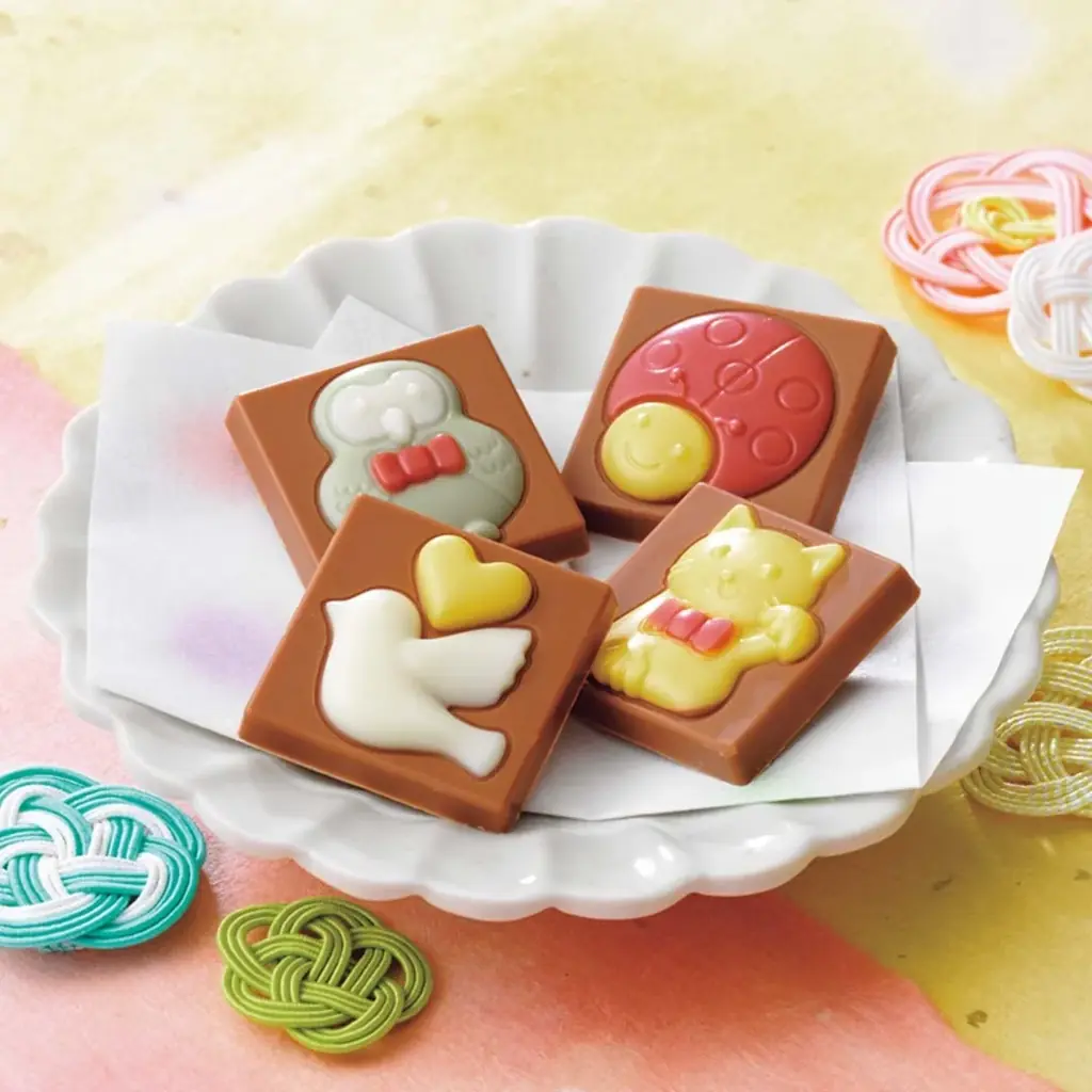 福めくりボックス以外にも迎春シーズン向けの限定商品が登場しています。代表的なものとしてロイズラッキーモチーフチョコ(期間限定)があり、幸運の象徴とされる4種の生き物やアイテムをモチーフにしたひと口サイズのチョコレートです。