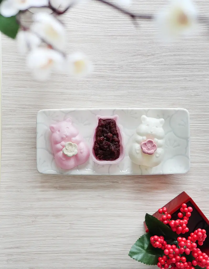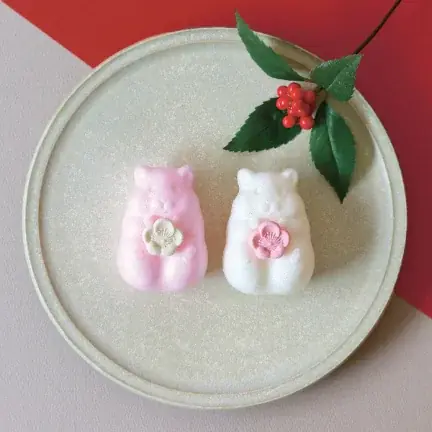 ハムスターの腹部にらくがんを添えることで「梅を抱えている」ような佇まいが完成し、見た目のかわいらしさと和菓子としての味わいを両立させています。