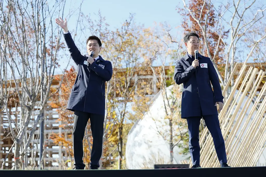 セレモニーには、2025年日本国際博覧会大阪パビリオン推進委員会 会長であり大阪府知事の吉村 洋文氏と、公益社団法人2025年日本国際博覧会大阪パビリオン 代表理事であり大阪市長の横山 英幸氏が登壇しました。両名はミャクミャクへの感謝の意や思い出を言葉にして会場に共有しました。