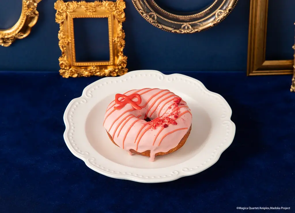 | 鹿目 まどか 「わたしの、最高の友達」ピンクドリームドーナツ | 税込590円 | ピンク色のチョコでコーティングしたドーナツにフリーズドライのいちごやリボントッピング。 |