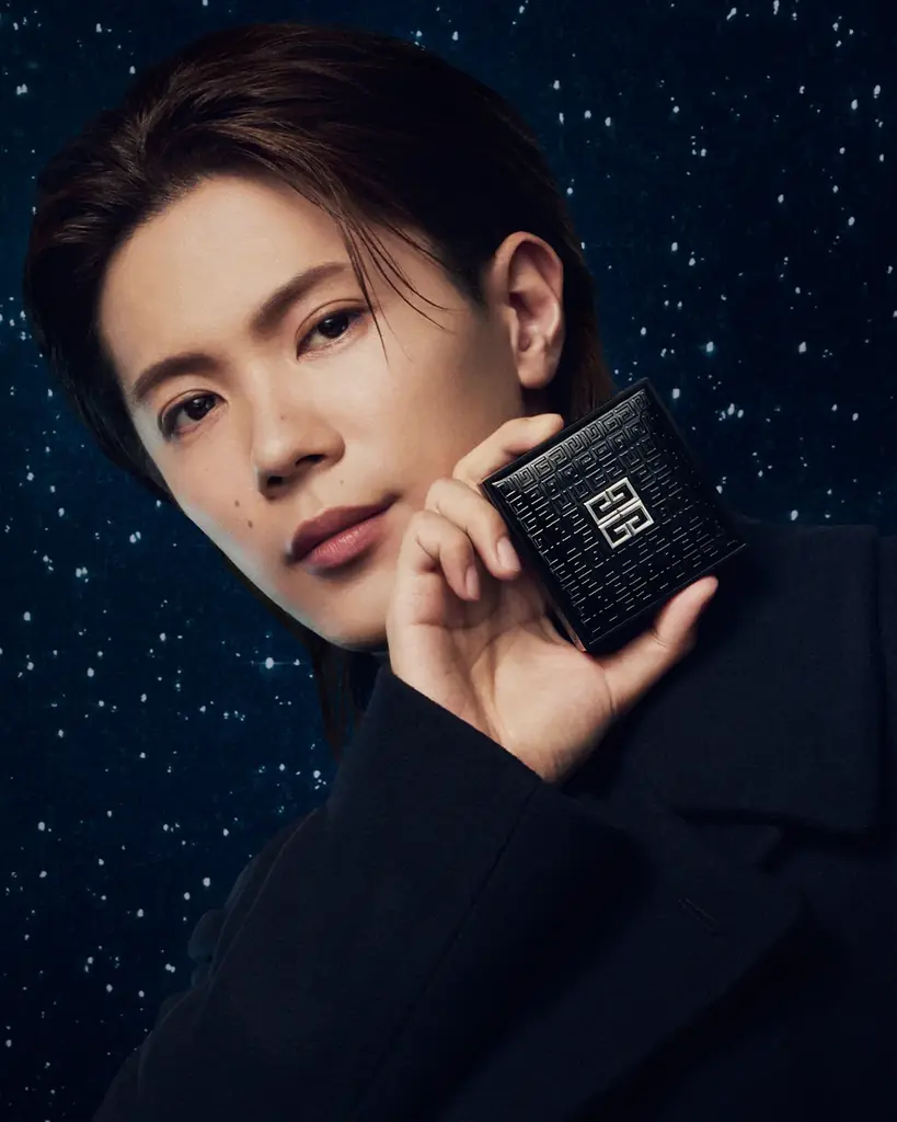 今回のキャンペーンで主にフィーチャーされるのは、ジバンシイのスキンケアとフレグランスの代表的な2アイテムです。ひとつは肌に透明感と滑らかさを与える「プリズム・リーブル・スキンケアリング・グロウ・クッション」、もうひとつは深みと印象を残す「ランテルディ ルパルファム」です。撮影ではこれらが互いに響き合い、ホリデーシーズン特有の華やかさと気品を表現しています。
