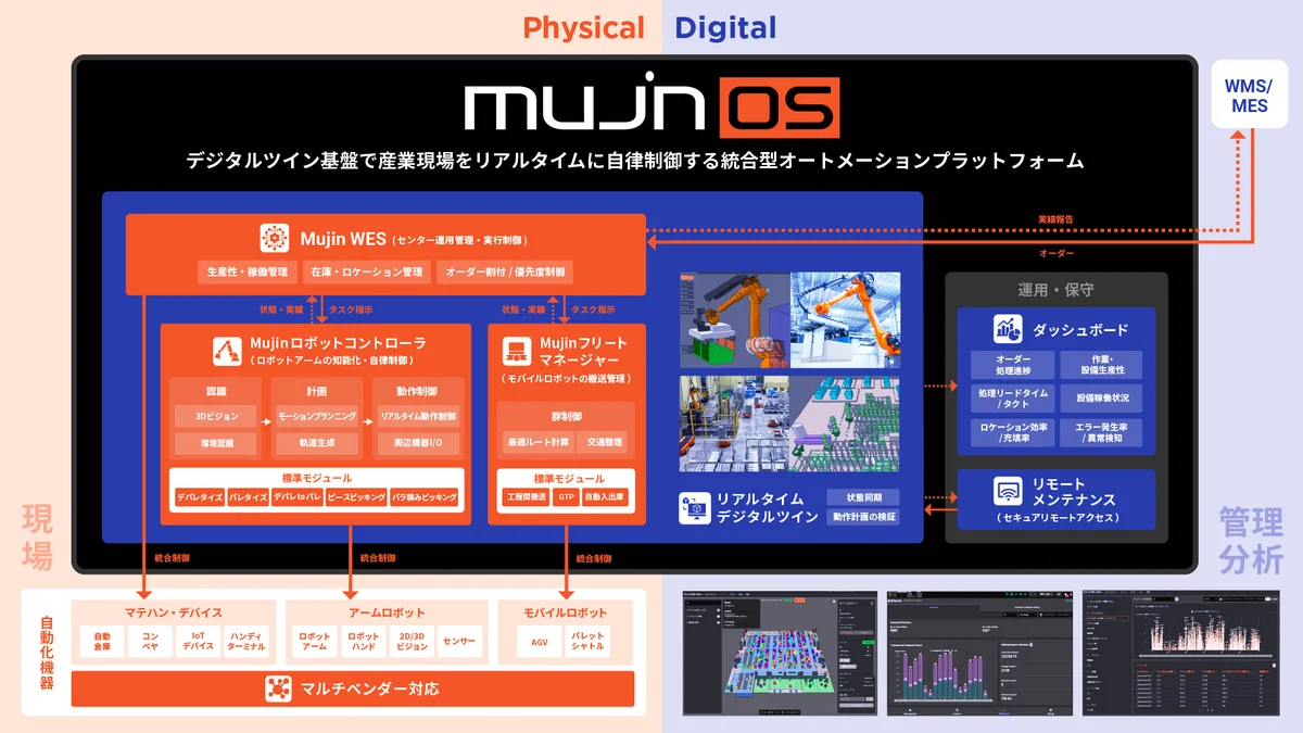 Mujinは独自のフィジカルAI、ロボット認識、動作計画、デジタルツイン技術を核に、統合型オートメーションプラットフォーム「MujinOS」を開発・展開しています。MujinOSはロボット、AGV、保管システム、ビジョンセンサ等をデジタルツイン環境で統合制御し、現場のデータをリアルタイムに吸い上げることで、止まらない運用や最適化を可能にする点が特徴です。