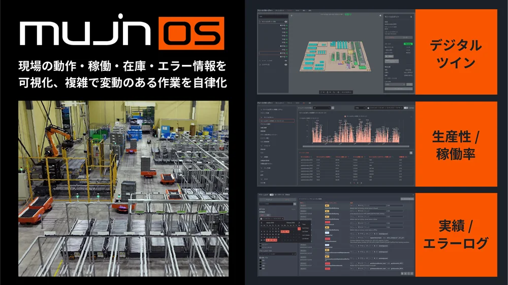 - 工場・倉庫全体のデジタルツイン化の加速:MujinOSをリアルタイム運用エンジン兼動的データベースとして活用し、トレーサビリティ、在庫追跡、問題の早期検知、ワークフロー最適化、パフォーマンス予測を強化。