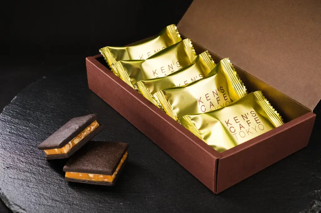 - KEN’S キャラメルサンド:5個入り。くちどけなめらかなキャラメルを香ばしいカカオクッキーでサンド。くるみが食感のアクセント。賞味期限60日。アレルゲン:卵・小麦・乳成分・大豆・くるみ。