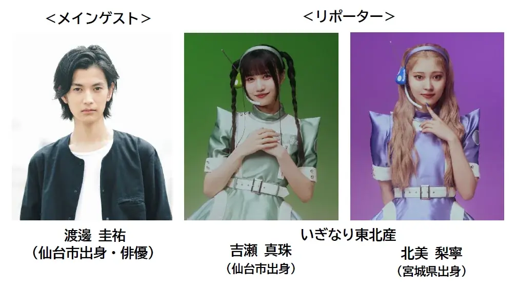出演陣は地元ゆかりのタレントと社内アナウンサーを組み合わせ、地域色と放送局の信頼感を両立させています。中心となるのは、仙台市出身の俳優渡邊 圭祐がメインゲストとして現地の盛り上がりを伝えます。