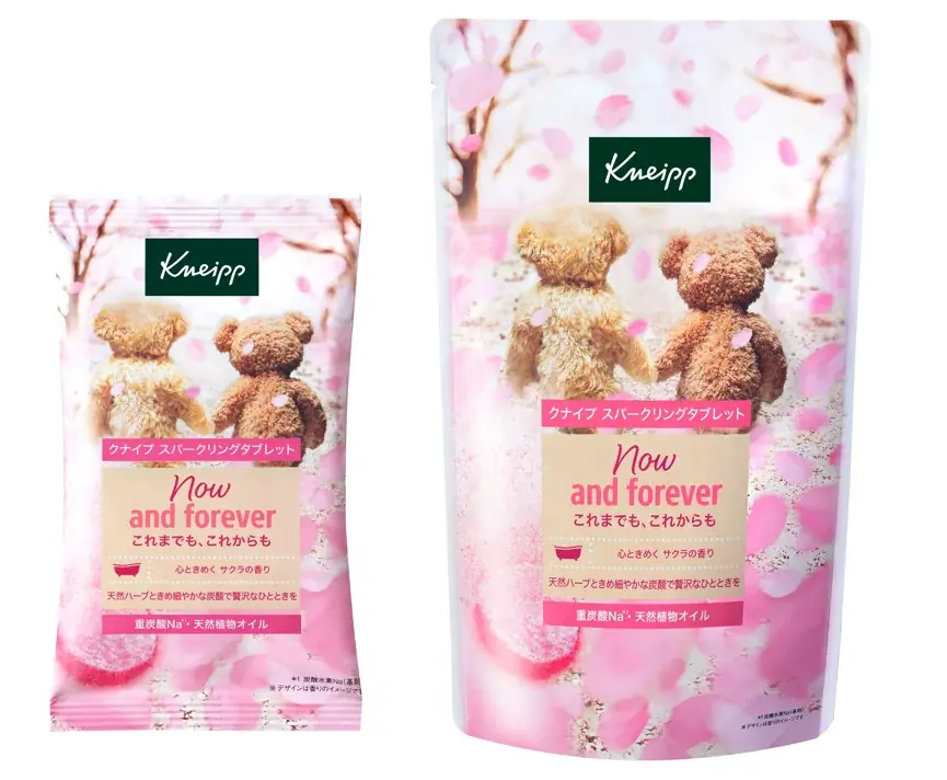 | クナイプ スパークリングタブレット サクラの香り | 炭酸入浴料(タブレット) | 50g(1錠) 308円 / 50g×6錠 1,540円(税込) | 重炭酸Na(基剤)、サトザクラ花エキス(保湿)、アルガンオイル(保湿) | Now AND FOREVER これまでも、これからも |
