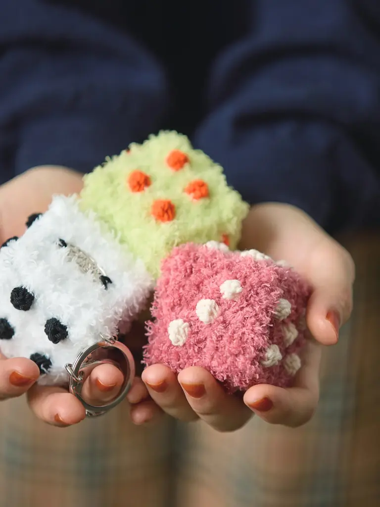 特に「サイコロキーホルダー」は、かぎ針編みをほとんど使わず、編み物用のメッシュシートにとじ針で毛糸を通していくだけで形になる初心者向けの作品です。初めて編み物に触れる人でも取り組みやすい工夫が施されています。