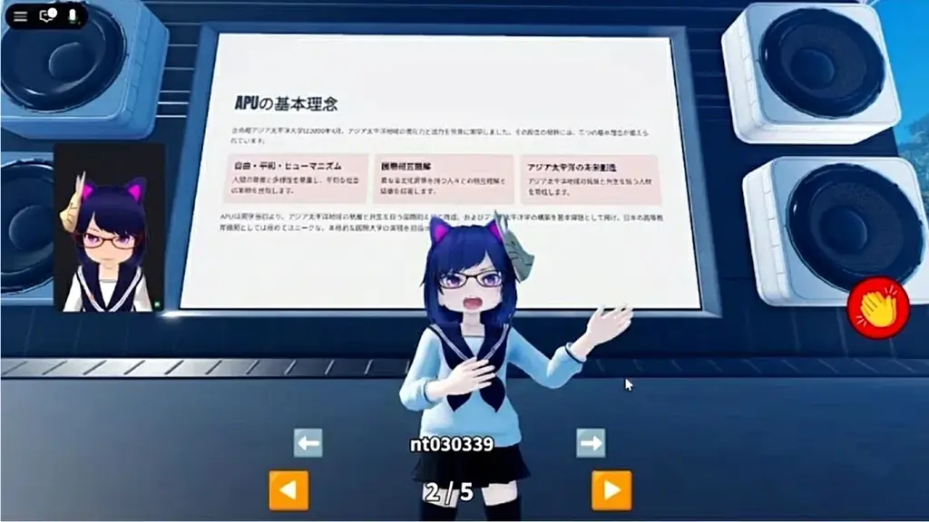 発表資料によれば、Metaverse APUは単なるソーシャル空間にとどまらず、講義や発表に利用できるプレゼンテーション機能を搭載した教育利用を想定した設計になっています。プラットフォームには誰もが利用しやすいRobloxを採用し、継続的な関係維持やコミュニティ活性化を目指す点が強調されています。