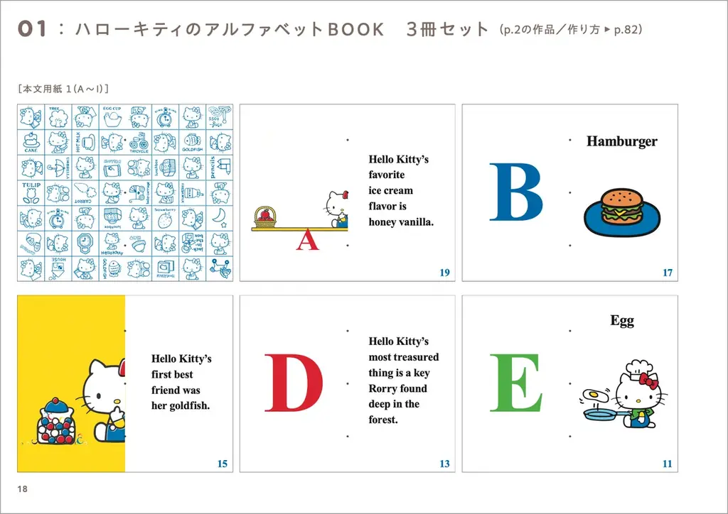 掲載作品の多くは完成後におよそ3〜5cm程度のサイズで、表紙や本文ページのイラスト、キャラクターの小ネタやメッセージ、豆知識が盛り込まれています。たとえば「キティの身長はりんご5つ分」といった豆知識や、キキ&ララの宝物に関する説明、じんと来るメロディの言葉など、読み物としても楽しめる要素が含まれます。
