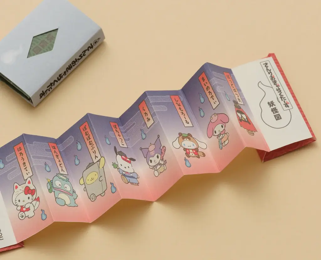 ハローキティ、ハンギョドン、ポムポムプリン、ポチャッコ、クロミ、シナモロール、バッドばつ丸らの妖怪化した姿を、折本スタイルの「パタパタ折り」で表現しています。 - 09:サンリオキャラクターズの旅の思い出BOOK(2冊セット)