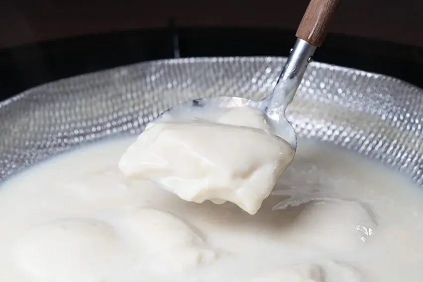 鍋料理の後には、佐賀・嬉野温泉の泉質を生かした特製出汁で仕立てる温泉豆腐を提供します。豆腐は佐賀県産大豆〈フクユタカ〉を使用した寄せ豆腐で、とろけるようななめらかな口当たりが特徴です。塩と香り高い胡麻だれを併せて出します。
