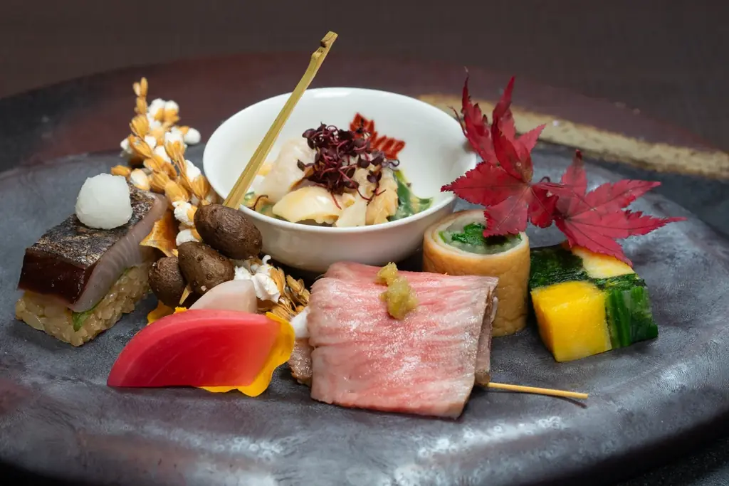 前菜は月替わりの盛り合わせと、月替わりの一品が用意されています。佐賀牛の出汁漬けローストビーフや旬の魚介を用いた押し寿司、野菜テリーヌなどを組み合わせ、訪れるたびに異なる味わいを楽しめる構成です。