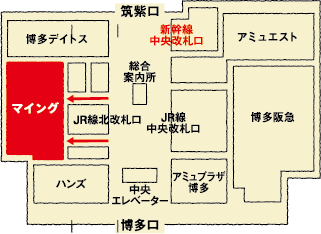 博多エキナカ マイングは博多駅構内1階に位置する九州でも最大級の博多・九州のおみやげ処で、食品店や土産店などを中心に構成されています。地元利用の多い商業施設でもあり、県外からの来訪者と地元客の双方に利用されています。