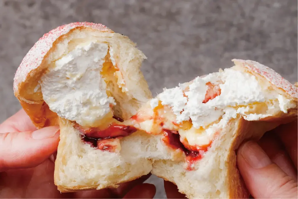 食パン生地にカスタードクリームとイチゴジャムを包んで焼き上げ、ホイップクリームを絞り込んだ一品。お子様から大人まで楽しめる優しい味わいです。