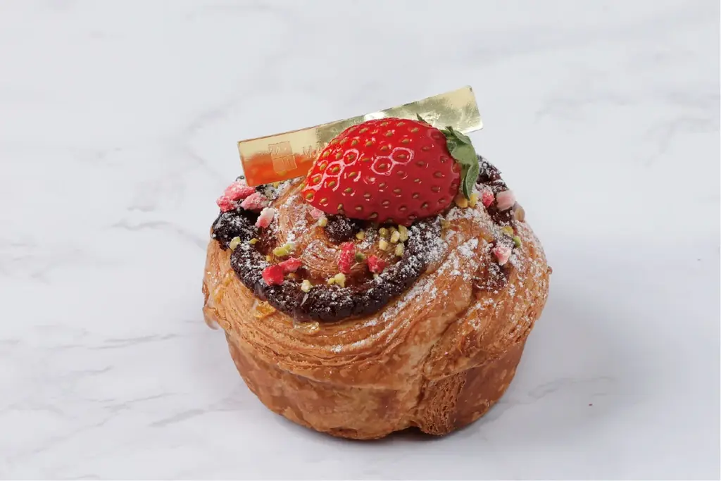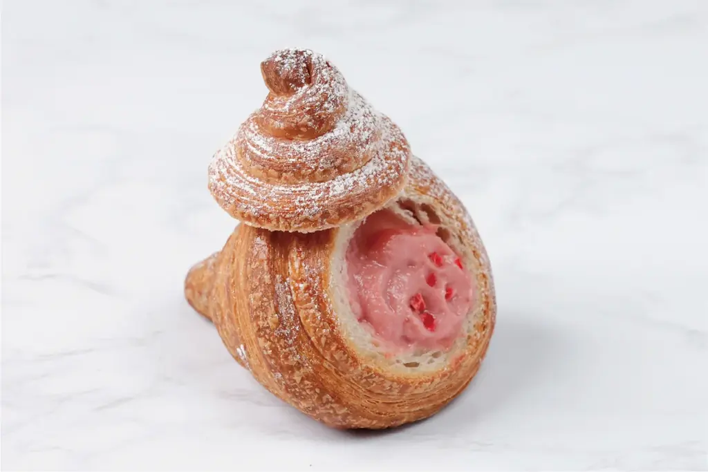 発酵バターを贅沢に使用したサクサクのクロワッサン生地に、特製の苺クリームを絞り込んだコルネ。食感と香りに配慮した設計です。