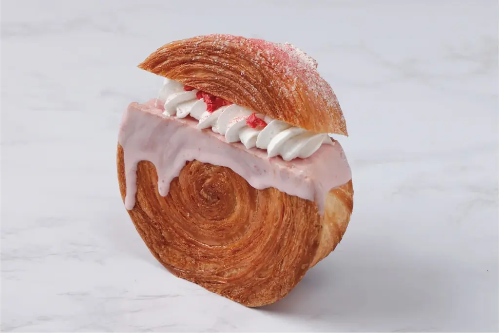 ツリーリングスのような形状のクロワッサンにあまおう苺クリームとホイップクリームでデコレーションした華やかな一品。店頭での視覚的な訴求も意図しています。