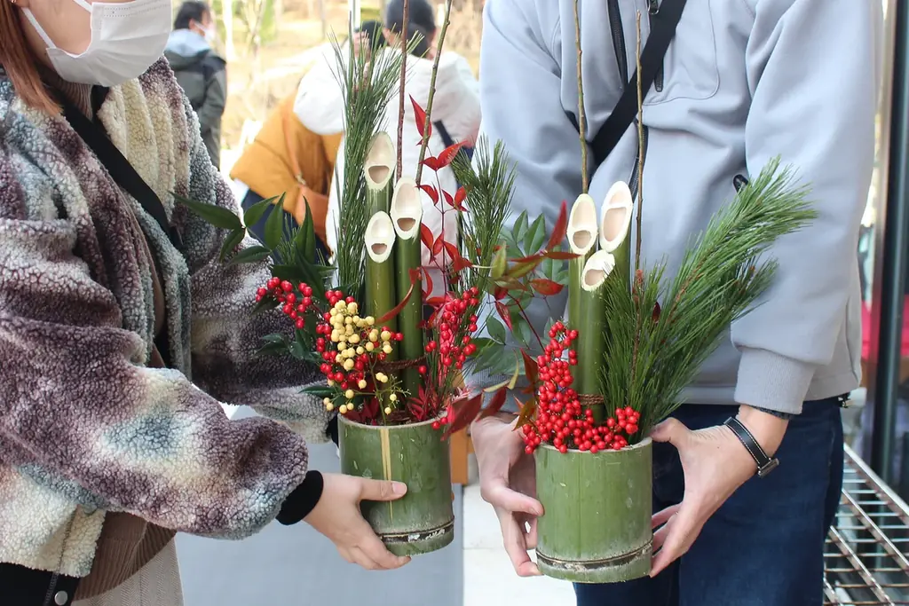 毎年人気のミニ門松づくり体験を実施します。使用する素材は松・竹・南天で、高さ約30cm程度のミニ門松を作ります。新年の飾りとして持ち帰れるサイズで、手作りの風情を楽しめます。