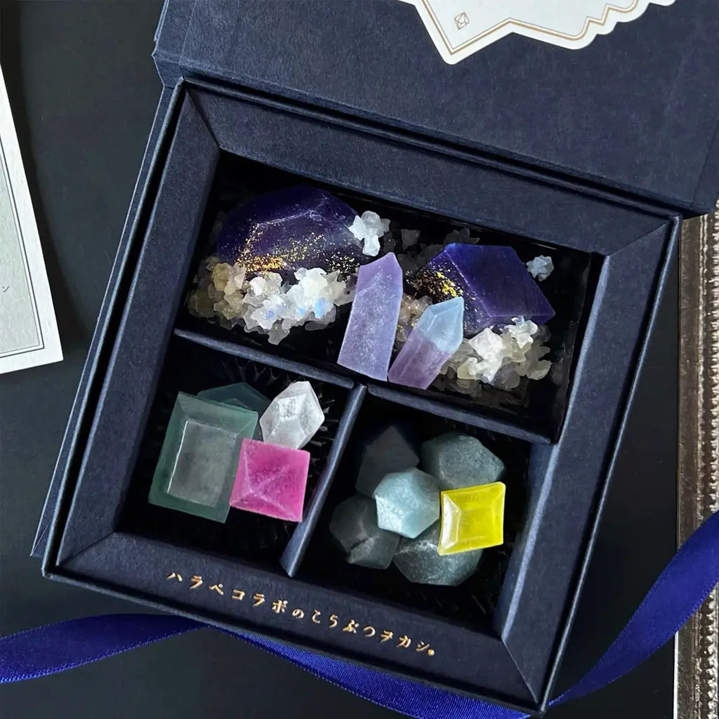 価格は3,240円(税込)。表面がシャリっと、中がぷるんとした食感が特徴で、贈り物や個人のご褒美用途に適しています。化粧箱は鉱物採取箱をイメージしたデザインです。