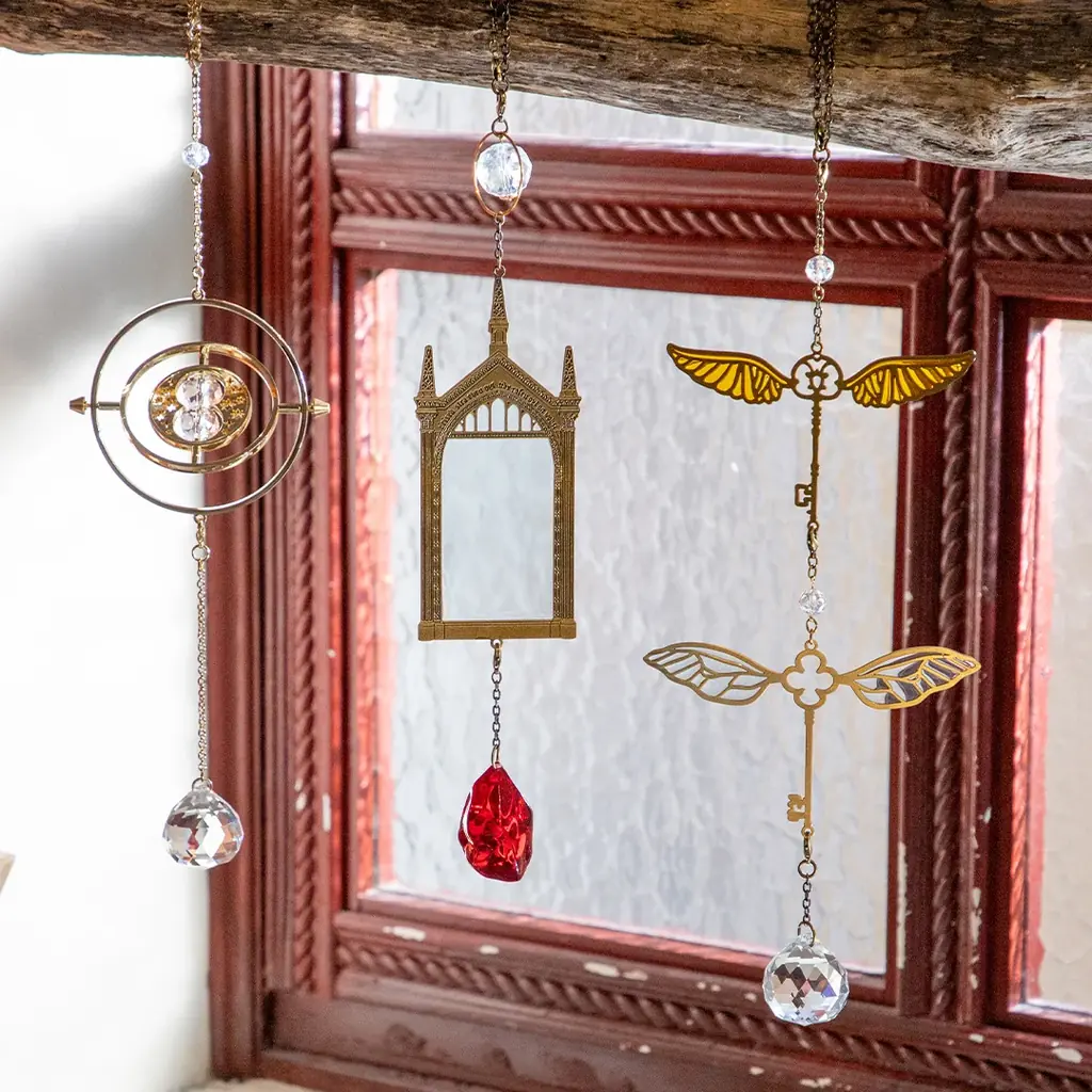 今回の主な新商品は、窓辺に吊るして太陽光を取り込み、室内にきらめきをもたらすサンキャッチャーが中心です。サンキャッチャーは「みぞの鏡」「フライングキー」「タイムターナー」の3種で、ステンドグラス風の輝きや羽の精巧な造形、砂時計が回転する仕組みなど、作品の造形美を再現するための細部にこだわっています。