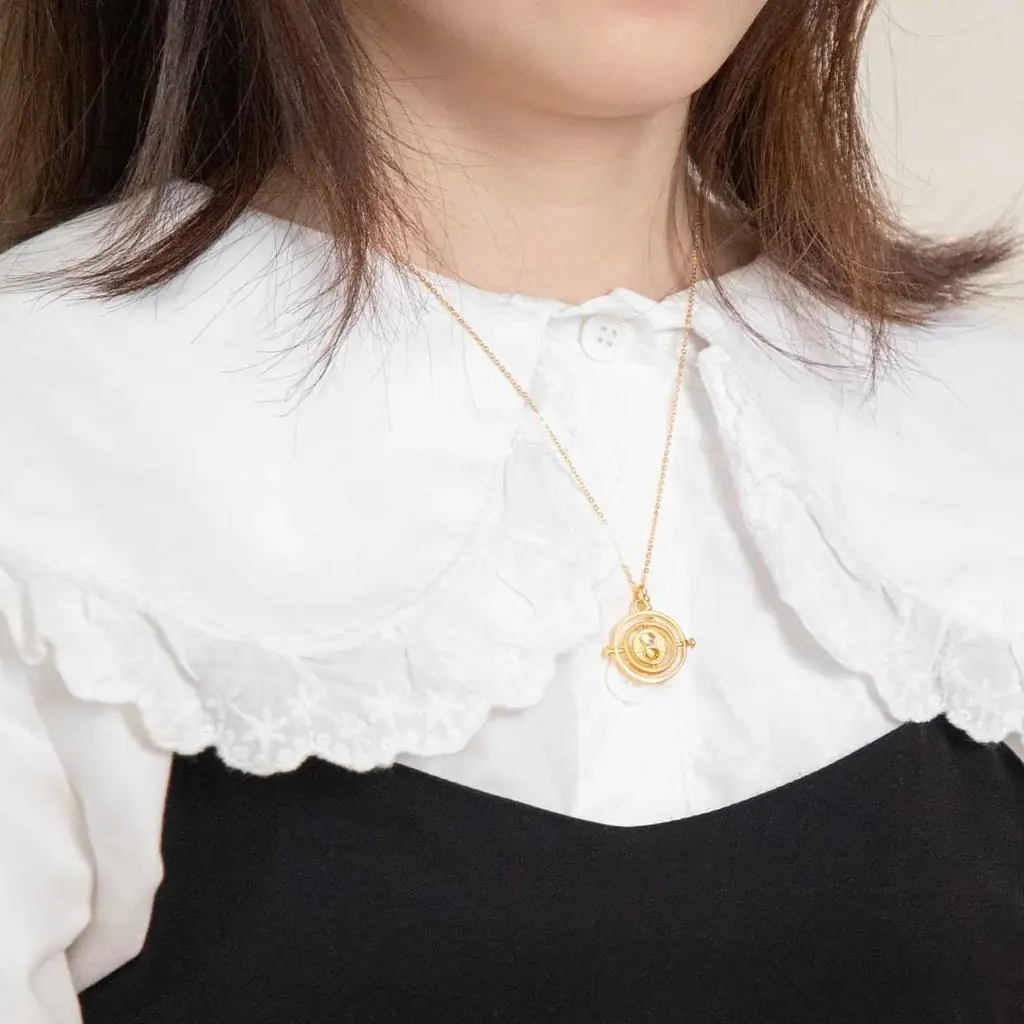 タイムターナー シルバーネックレスはペンダントトップにシルバー925を用い、金メッキ加工が施されています。砂時計部分には水晶とシトリンの天然石がセットされ、砂時計が回転する仕様を再現しています。高級感のある材質と動作機構により、自分へのご褒美や贈り物としても想定された商品です。