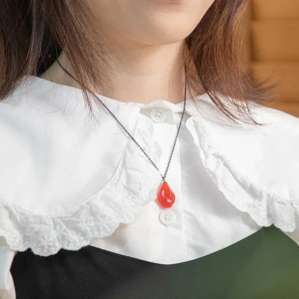 賢者の石ネックレスは、賢者の石部分にレッドクオーツァイトの天然石を使用し、手作業で成型した石は一つごとに色味や形状が異なります。チェーンや金具類には丹銅や真鍮などを用い、セレブレーションイヤーを記念する特別なアイテムとして位置づけられています。