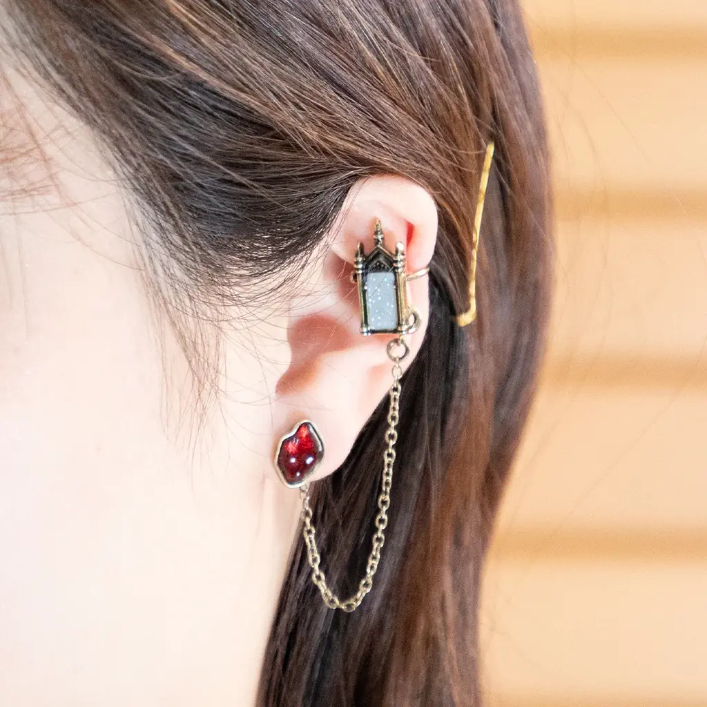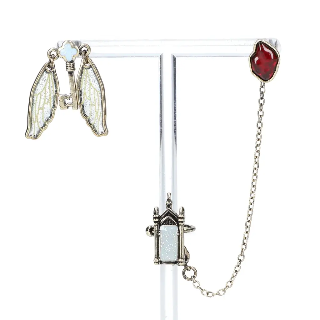 賢者の石とフライングキーを組み合わせたピアス・イヤーカフセットは、アクセサリーとして単品使用のほか、賢者の石とみぞの鏡を専用のチェーンで組み合わせて使える点が特徴です。フライングキーは左右の羽が揺れる仕様で小ぶりながら存在感があります。