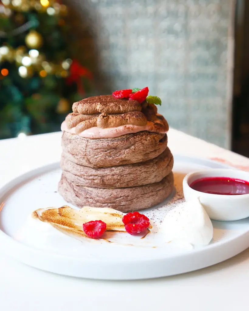本メニューは、ふわふわ食感のパンケーキ生地にココアを練り込み、軽やかなメレンゲ、なめらかなマスカルポーネを用いたチョコムース、甘酸っぱいベリージャム、口どけの良いベリームースを重ねた一皿です。生地のふんわり感とムースの濃厚さ、ベリーの酸味が層になって食感と風味の変化を楽しめる構成になっています。