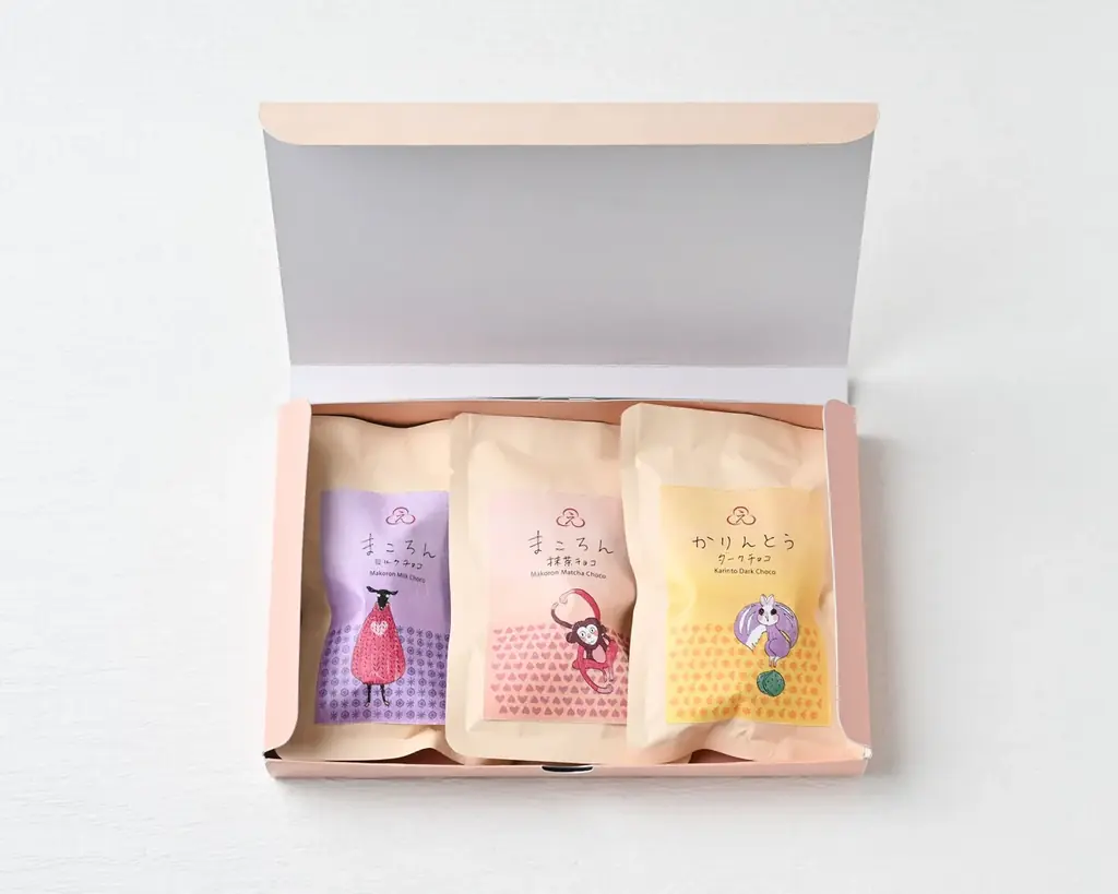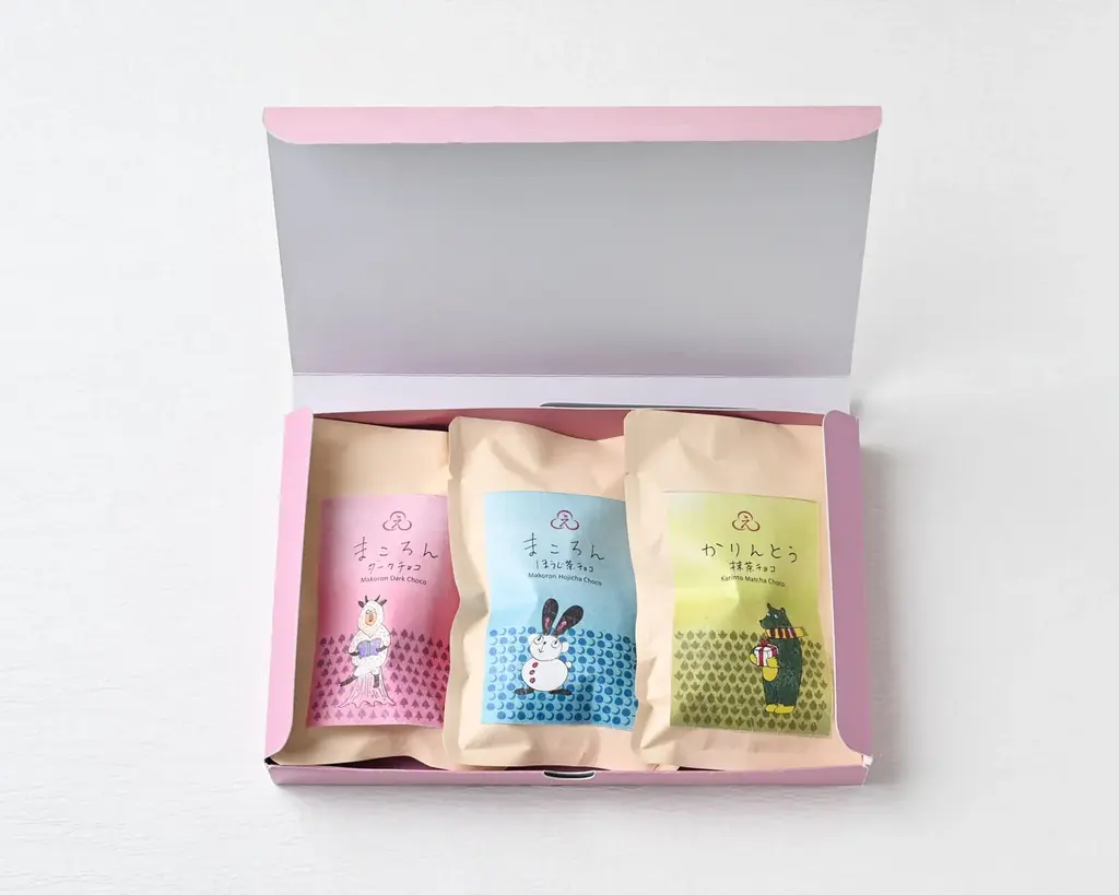| 森からのおくりもの ピンク | まころんダークチョコ・まころんほうじ茶チョコ・かりんとう抹茶チョコ(3種入り) | 1,404円(税込) |