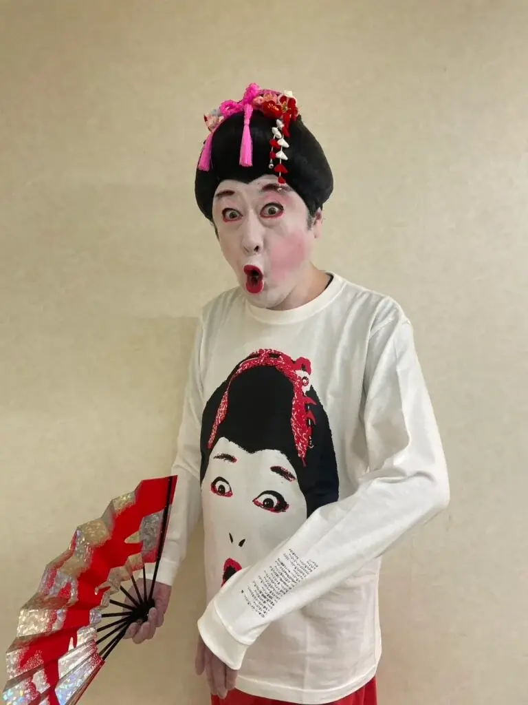 説明: 顔面白塗りをフィーチャーしたロングスリーブTシャツ。フロントに大きな顔面プリント、左袖にコウメ太夫おなじみのネタのカンペを再現しています。コウメ日記の演出をそのまま着用できるようなデザインが特徴です。