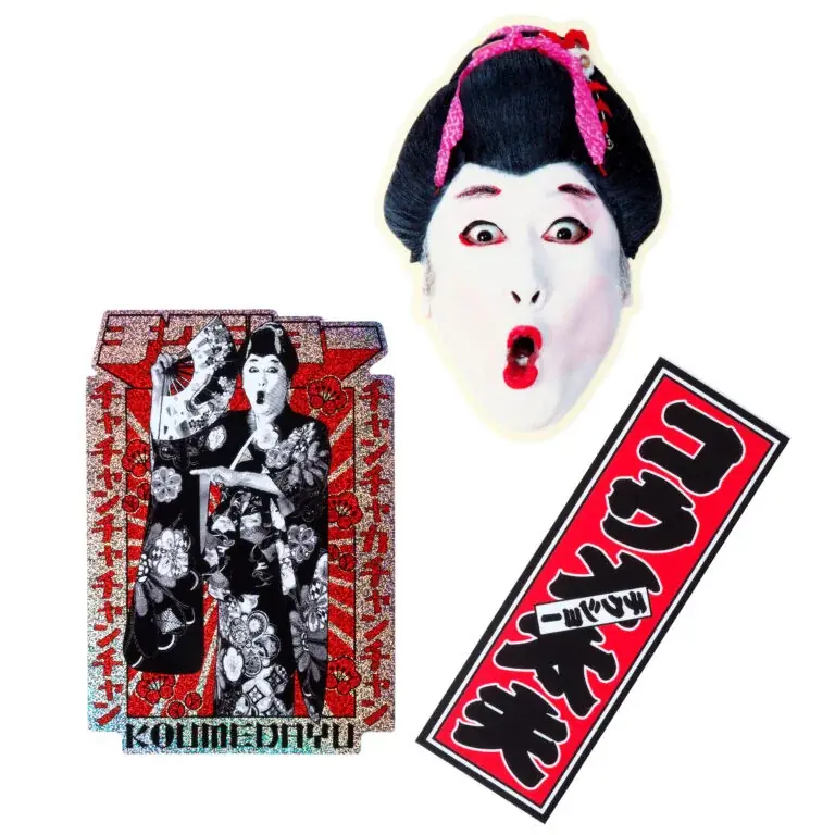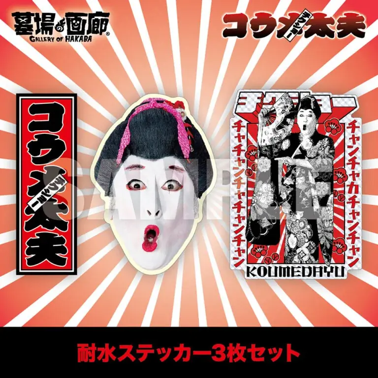 説明: 耐水性に優れたステッカーの3枚セット。ラインナップは「千社札」「顔面」「コウメ太夫」。説明文では「雨に濡れても滑らない」と表現され、アウトドアや日常使用での耐久性を意識した仕様です。