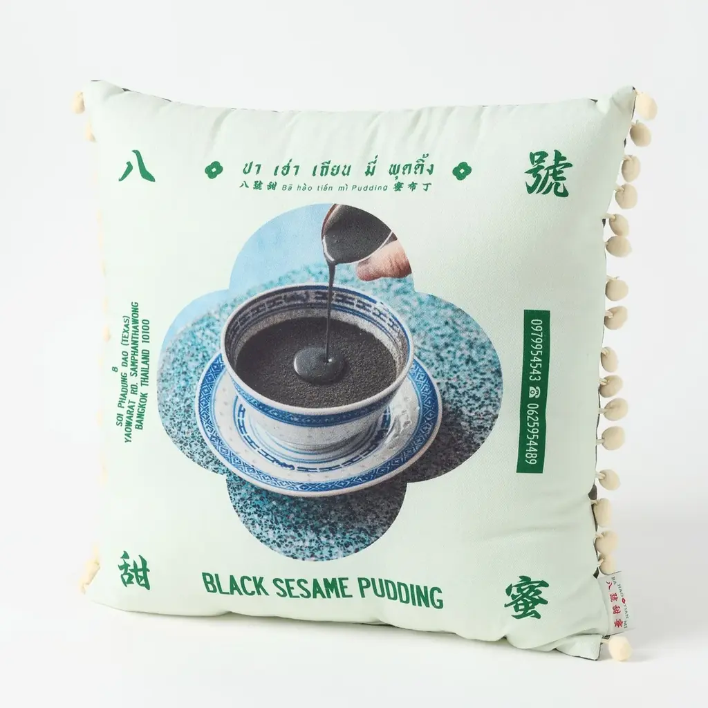 - クッション/プリン柄:価格2,750円(税込)、カラー=ベージュ、サイズ=FREE。黒ごまプリンを大きくプリントした正方形タイプ、左右にポンポン飾りをあしらったデザイン。