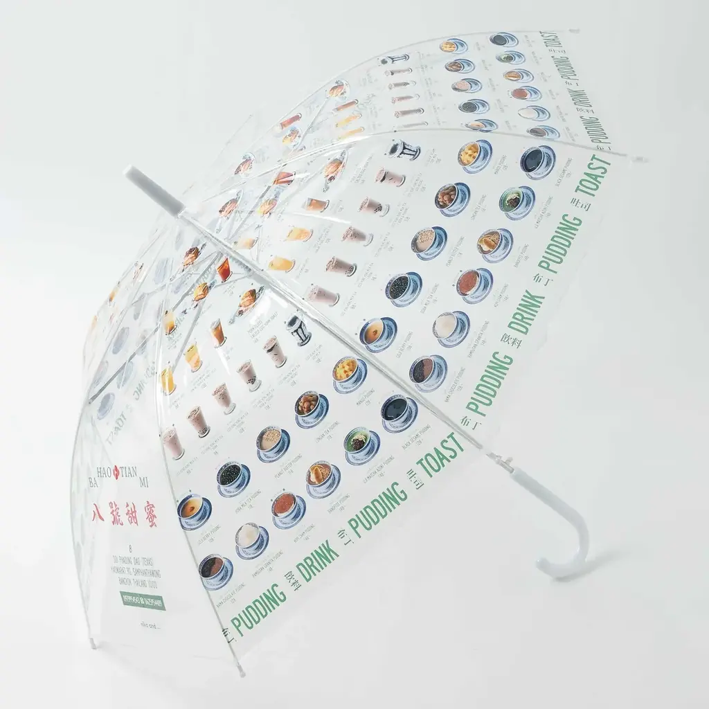 日常のアクセントになるビニール傘もラインナップされています。傘はお店のメニュー表をそのままプリントしており、傘立てでも目立つデザインが特徴です。