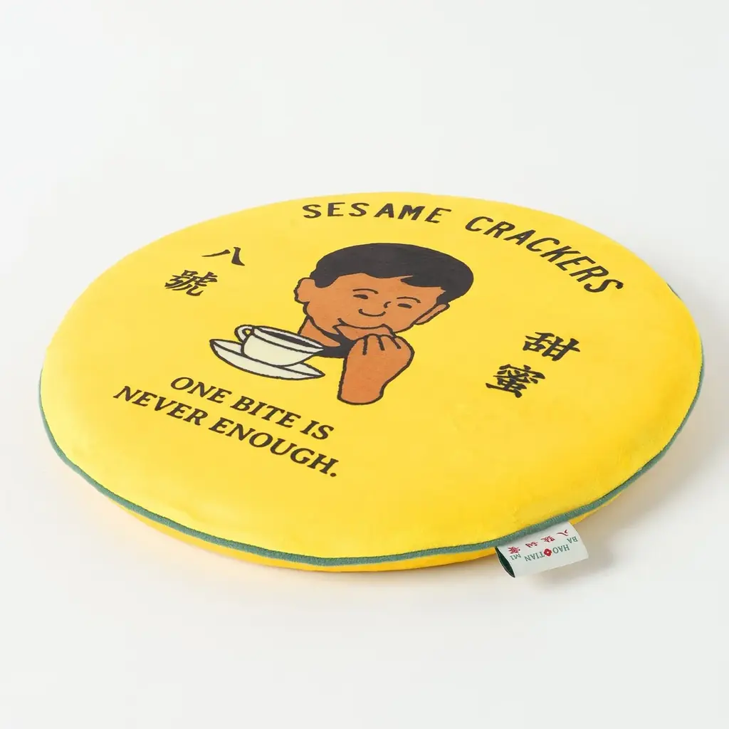 - シートクッション:価格2,750円(税込)、カラー=イエロー、サイズ=FREE。クッキー缶のデザインを落とし込んだ両面プリント仕様で、ダイニングやチェア用に適した厚み。