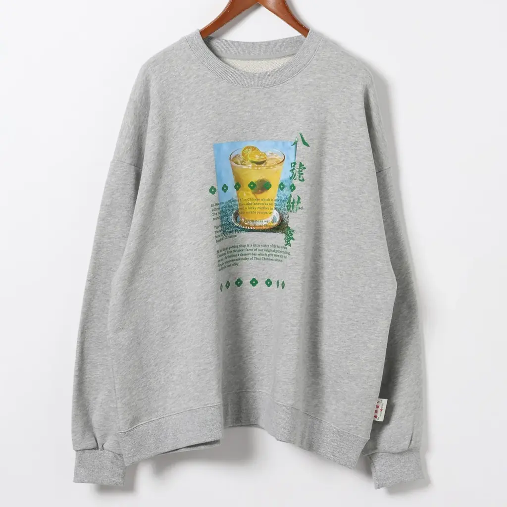 コラボのウェアとしては「【バー・ハオ・ティアン・ミー】コラボ 裏毛プルオーバー」がラインナップされています。プリンやドリンクをモチーフにしたアソート柄で、グラフィックに店名由来や住所があしらわれたユニークなデザインです。