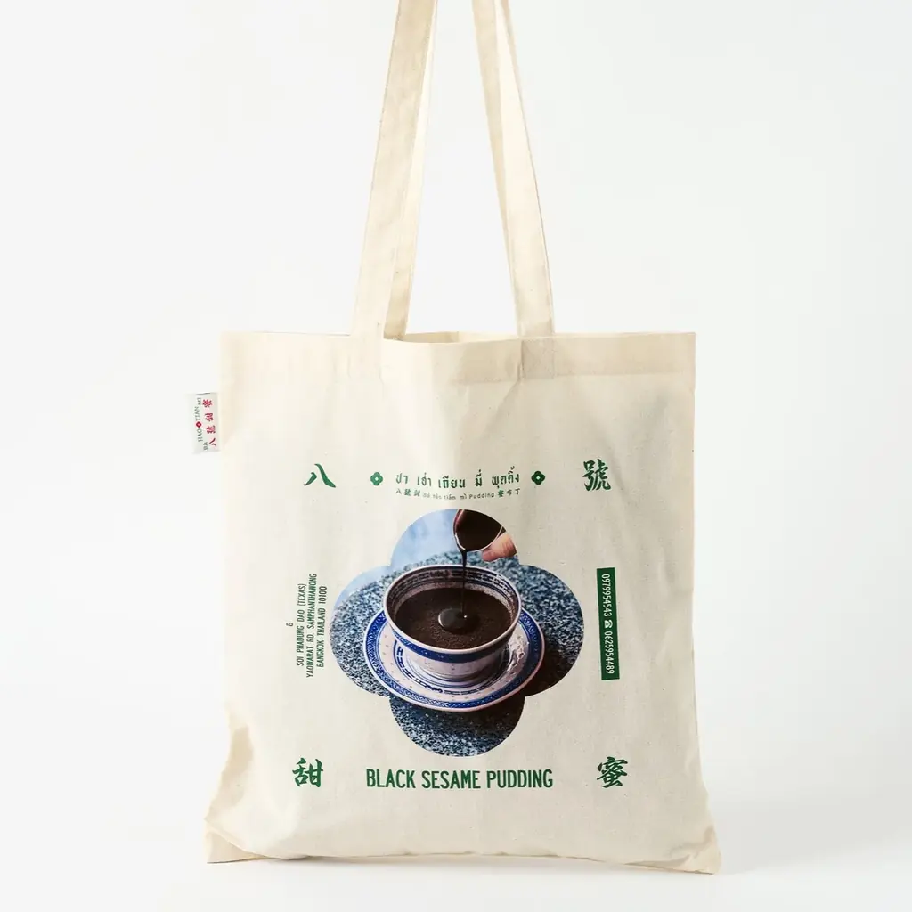 - シーチングトートバッグ:価格1,980円(税込)、カラー=オフホワイト、サイズ=FREE。人気の黒ごまプリンをプリント、裏面は英文字のコンセプト文と漢字ロゴを組み合わせたデザイン。持ち手は肩掛け可能な長さ。