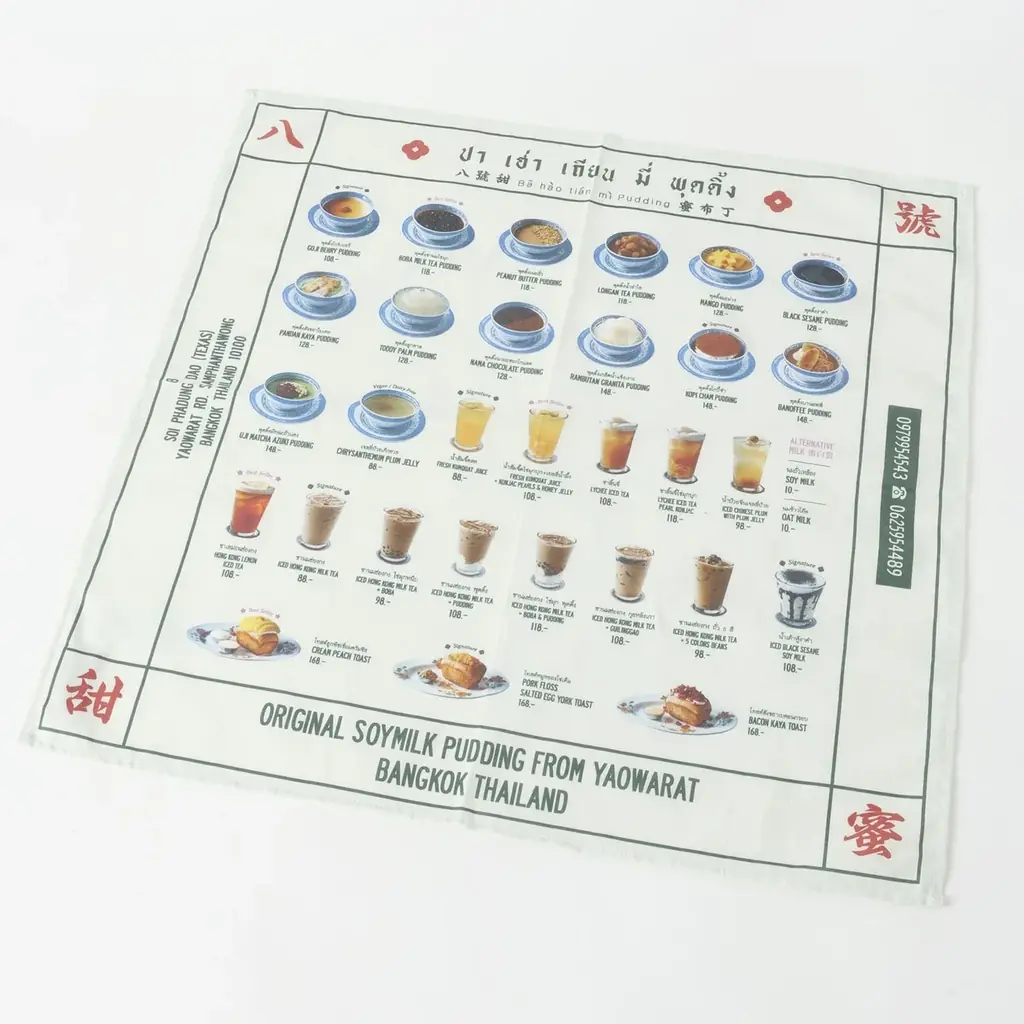 - バンダナ(ハンカチ):価格1,100円(税込)、カラー=掲載カラーのみ、サイズ=FREE。お店のメニュー表をそのままデザイン。ハンカチ以外にもインテリアやコーデのワンポイントとして活用可能。