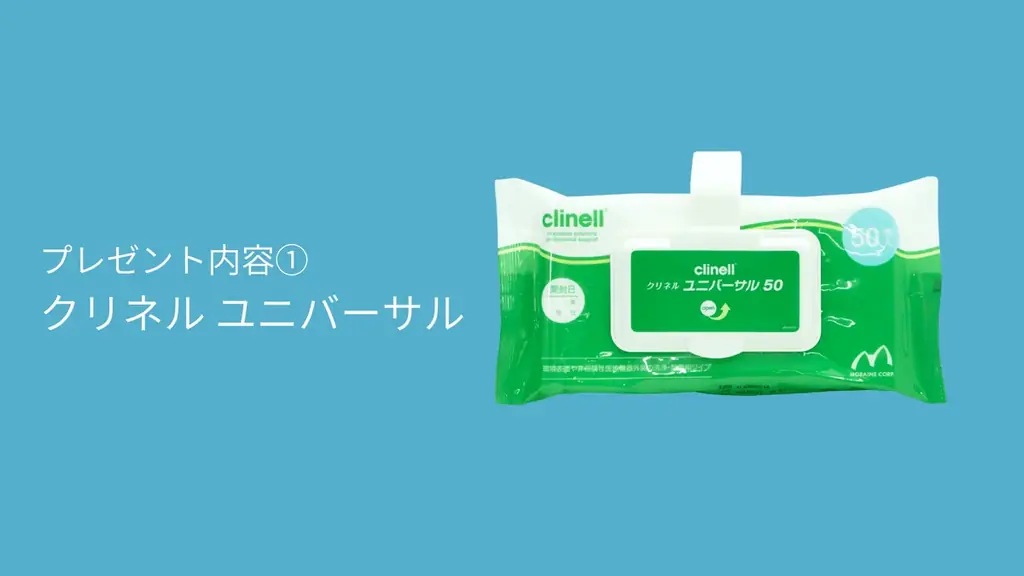 プレゼント内容 ①クリネル ユニバーサル(高性能除菌ワイプ)②グレイシアゼロ ニトリルグローブ(医療用使い捨て手袋)をセットで提供