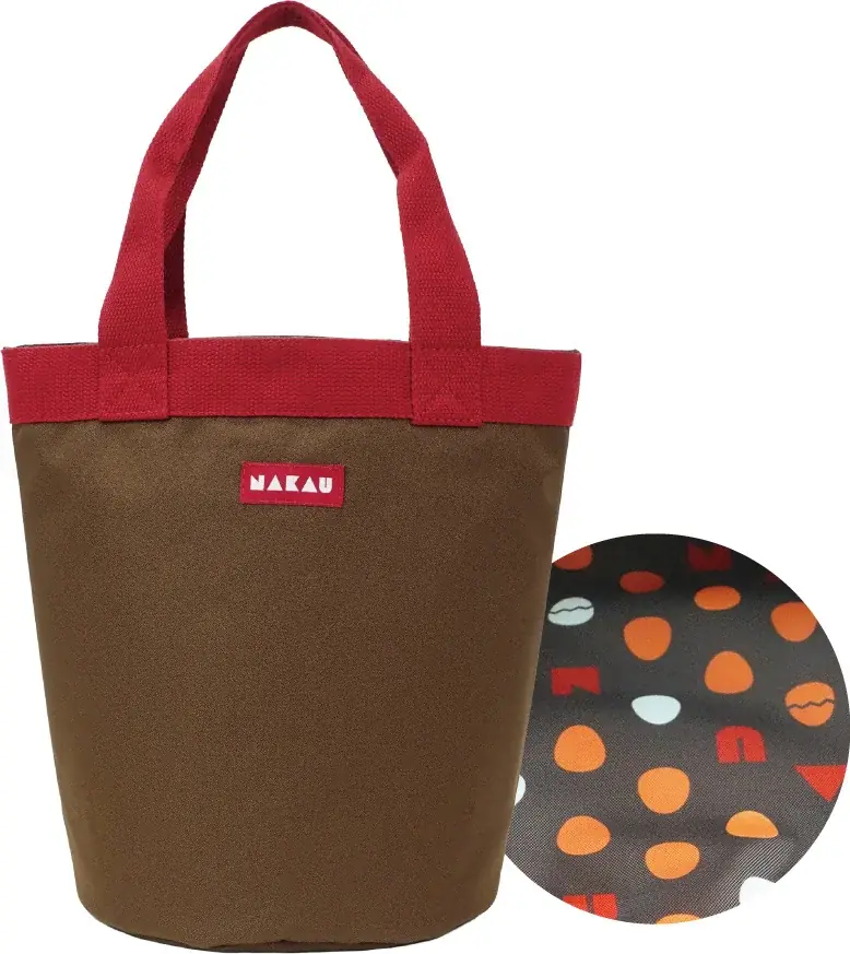 トートバッグの寸法は約タテ28.5×ヨコ34.5×マチ21㎝で、バケツ型の大容量設計です。落ち着いた風合いの素材に、なか卯の赤いワッペンが映える外観になっています。裏地には、なか卯が打ち出す「こだわり卵」をモチーフにしたたまごデザインが施されています。