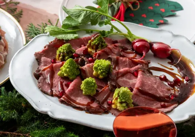 このメインプレートは、ローストビーフを中心にロマネスコをアクセントに用いることで、見た目にインパクトを出しつつ準備は短時間で済む構成です。味付けや仕上げに使用する調味料がポイントになっています。