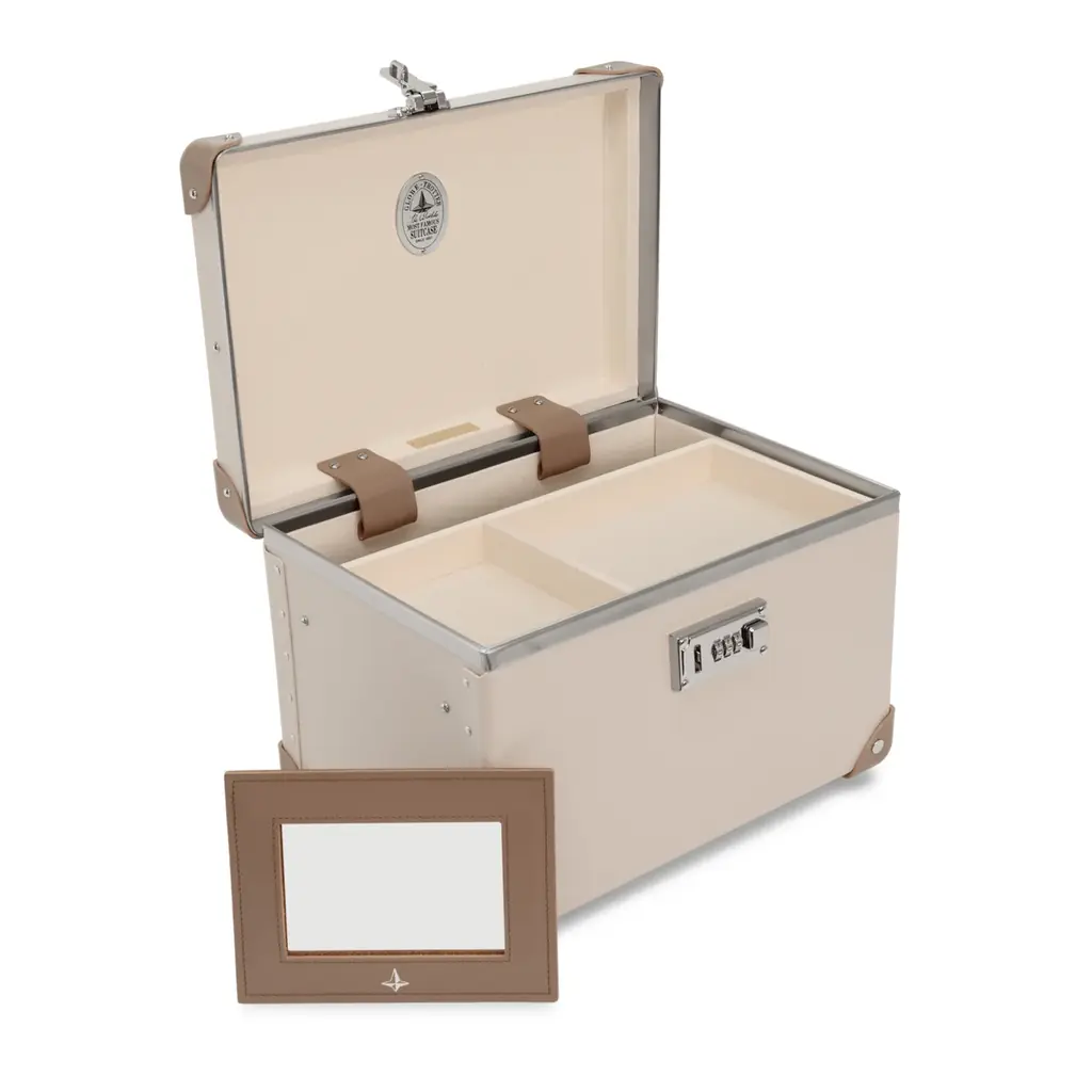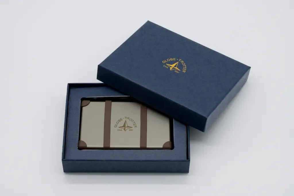 カードケースはグローブ・トロッターの象徴的なトランクフォルムを再現したもので、カラーはノーブルブラウン。コーナーやストラップ、開閉部のロックなどのディテールまで細かく作り込まれており、実用性に加えてコレクタブルな価値も意識された限定アイテムです。