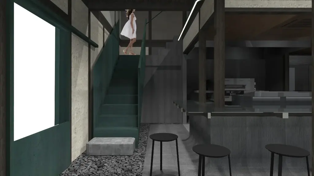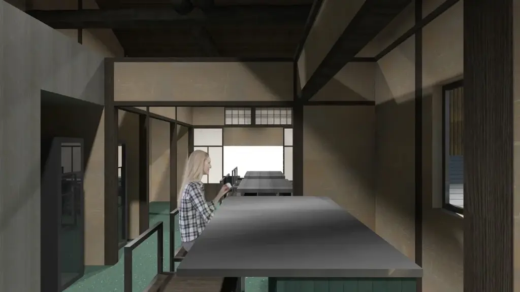 400℃ PIZZA KYOTOは築100年の町屋を改修して開業します。古き良き町屋の歴史的要素を残しつつ、現代デザインを融合させることで、京都らしさと新しさを両立した空間を目指しています。内装の基調色には伝統的に用いられてきた緑青色(ろくしょういろ)を採用しています。