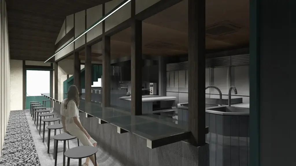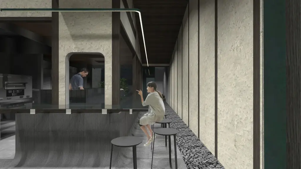 また、庭とキッチンをつなぐ「見る/見られる」設計や、通路に「あられこぼし」技法をモチーフにした意匠を取り入れるなど、視覚的にも細部にこだわった設計が行われています。店舗内にはカウンター席を中心に、半個室や2階のテーブル席を備えます。
