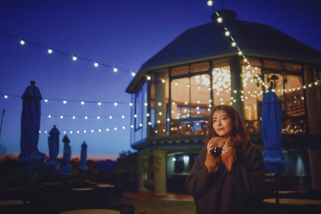 夜景を眺めながらのホットドリンクは体の芯から温める役割を果たします。ナイター営業は1Fテラスのみ実施されます。