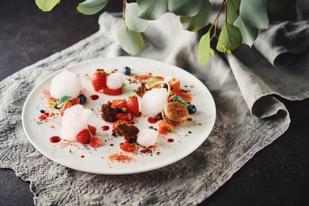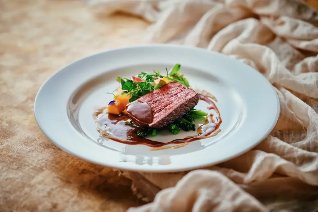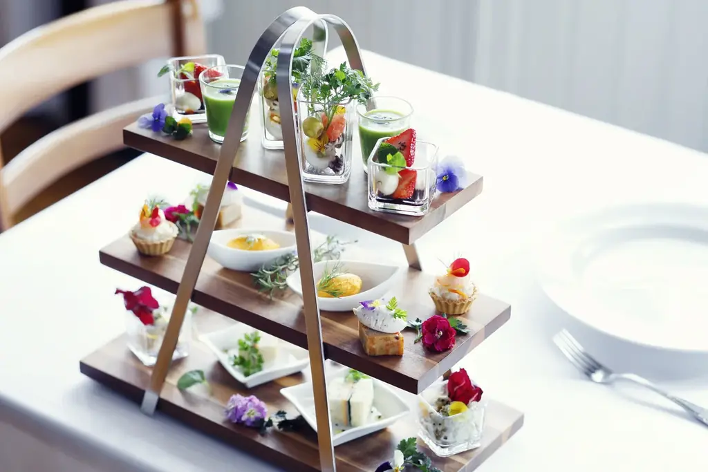 レストランでは「前菜スタンド」やエディブルフラワーの演出が食事体験の特徴となっています。味覚だけでなく視覚的にも季節感を演出するメニュー構成です。