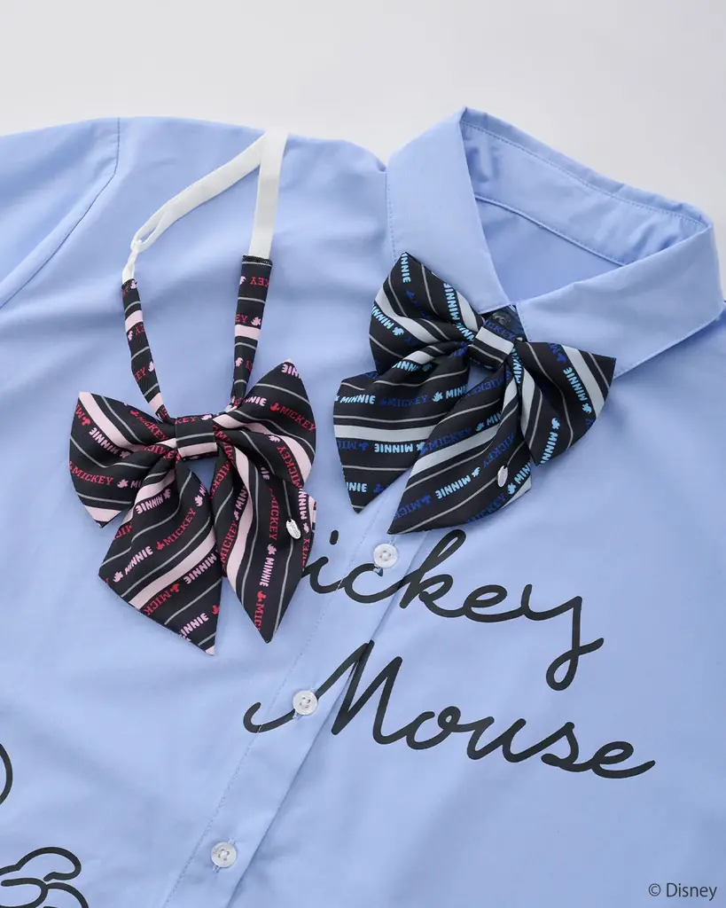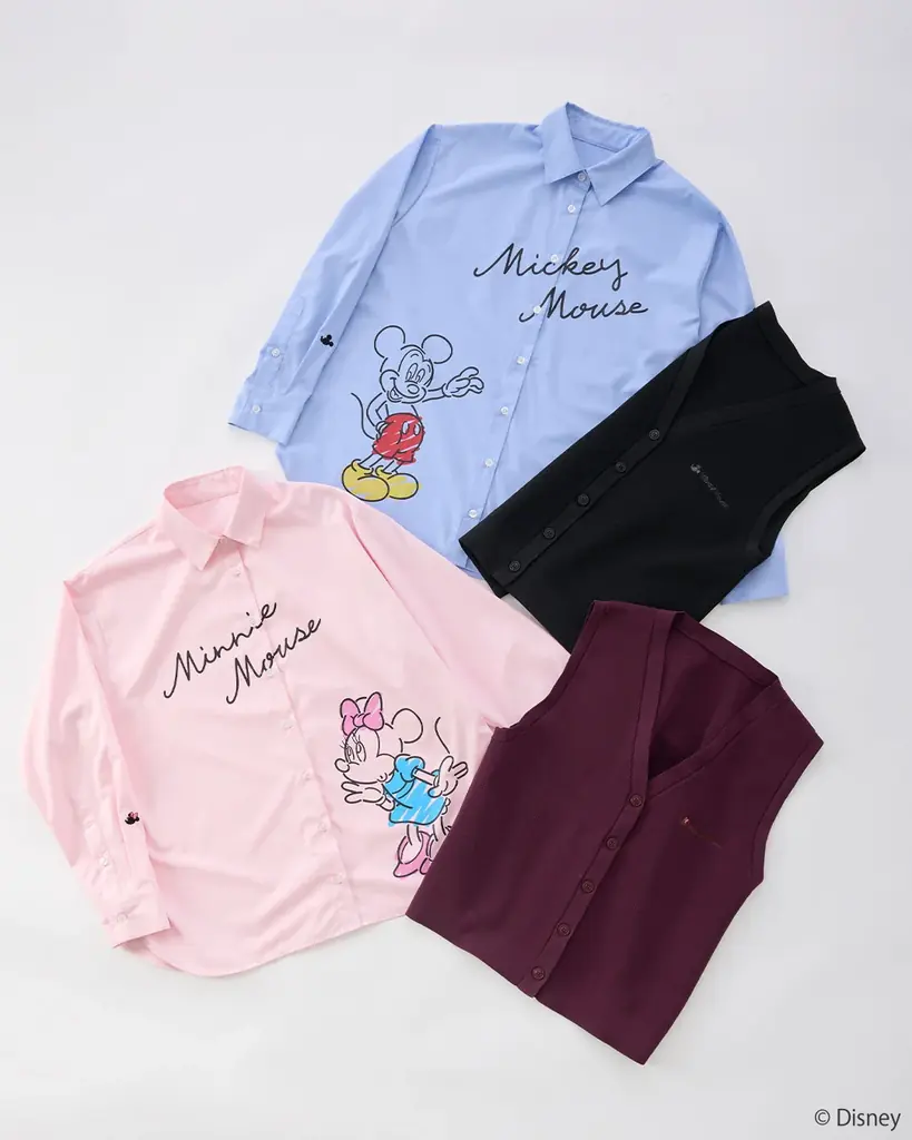 カラーはピンクとブルーの2色。ブルーはミッキーのアートを、ピンクはミニーのアートをそれぞれシャツにあしらっています。ゆったりめのシャツは動きやすさを優先し、ニットベストを重ねることできちんと感を演出します。