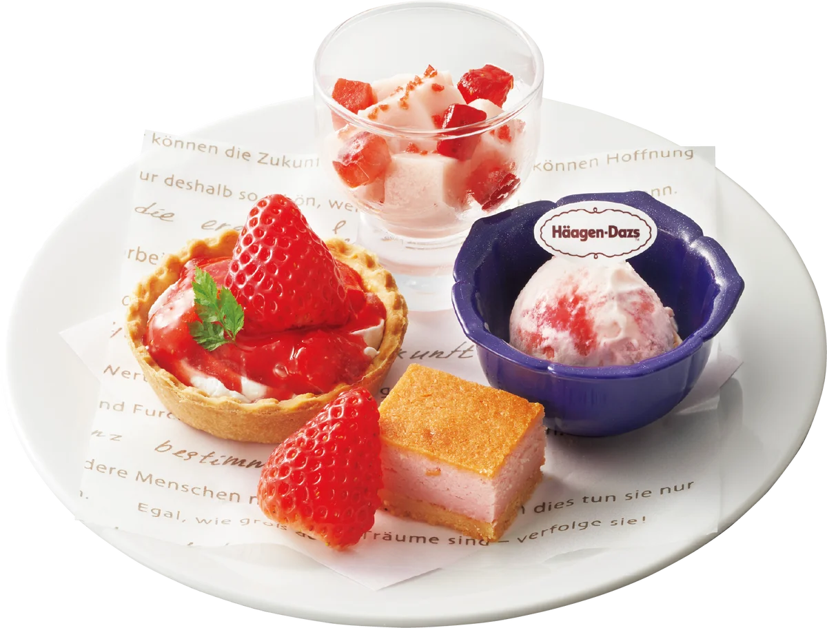 - いちごのミニデザートアソート 699円(税別)/税込768円:パイタルト、パンナコッタ、ハーゲンダッツいちごアイス、いちごチーズケーキを一皿で楽しめるアソート。